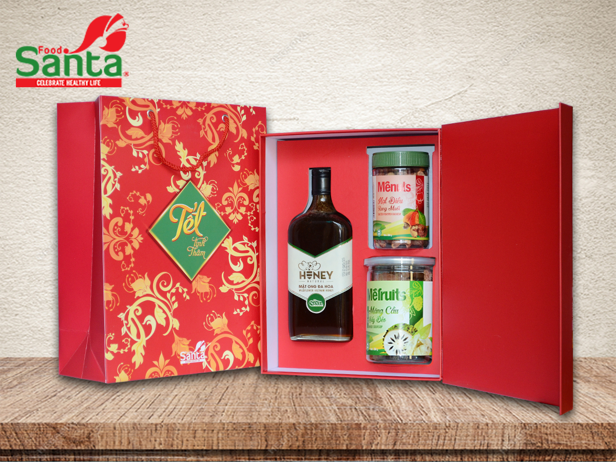 Bộ sản phẩm bao gồm: 01 chai Mật ong đa hoa 600ml. 01 hộp Mãng cầu sấy dẻo Mefruits 250g. 01 hộp Hạt điều Santafarm 200g.